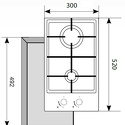 Поверхность: варочная панель • Тип поверхности: газовая • Рабочая поверхность: закаленное стекло • Число конфорок: 2 • Установка: независимая • Газовые конфорки: всего - 2 • Газ-контроль конфорок: есть • Тип управления: механическое • Переключатели: поворотные • Дизайн "Домино": есть • Электроподжиг: есть, автоматический • Размеры: 300x500 мм • Размер ниши для встраивания: 262x492 мм • Цвет: панель - черный