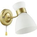 Бра стиля модерн для гостиной, кабинета или спальни имеет размеры 135x200x250 мм. Арматура светильника окрашена в латунный цвет. Лампы в комплекте - отсутствуют. В светильнике применяются лампы накаливания или светодиодная LED-лампа. Цвет плафонов - белый, с матовой поверхностью. Материал плафонов - стекло. Класс электробезопасности - I, степень пылевлагозащиты (IP) - 20. Максимальная мощность лампы (Вт) - 60. Светильник размещается на стене.