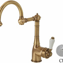Назначение: кухонный • Конструкция: однорычажный • Монтаж: горизонтальный • Материал: латунь, покрытие - бронза • Подводка: гибкая • Монтажные отверстия: 1 отверстие • Форма излива: традиционная • Душевая лейка в комплекте: нет • Аэратор: есть • Донный клапан в комплекте: есть
